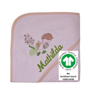 Geschenk Badeset Igel Schnecke rosa - BIO Kapuzen-Badetuch mit Waschhandschuh - bestickt